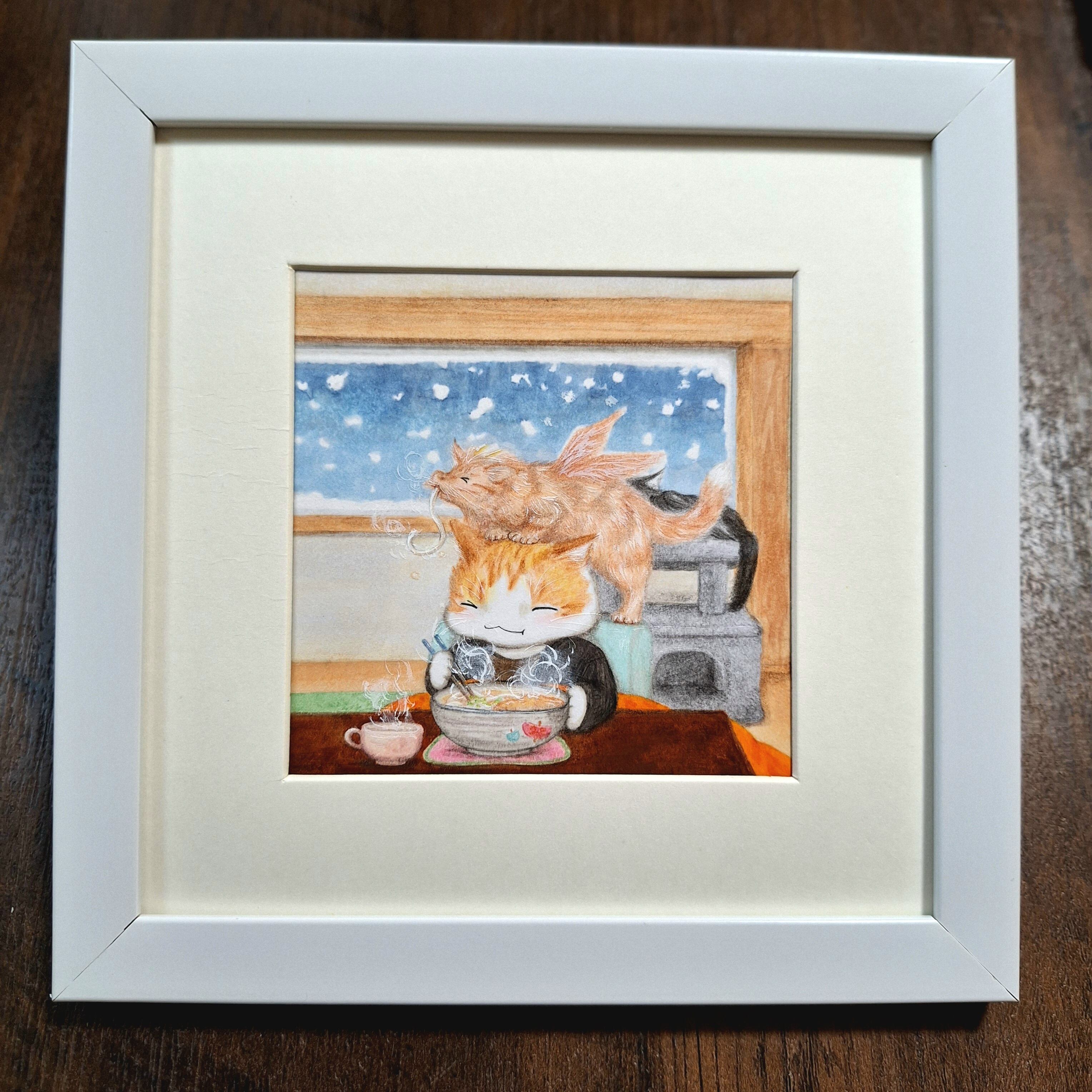 年越しはうどん派(*>ω<*) 画材 色鉛筆、コピック 額込みサイズ 約17cm角 額縁前面にはガラスを使用しています。 画像の額に入れてお送りします。