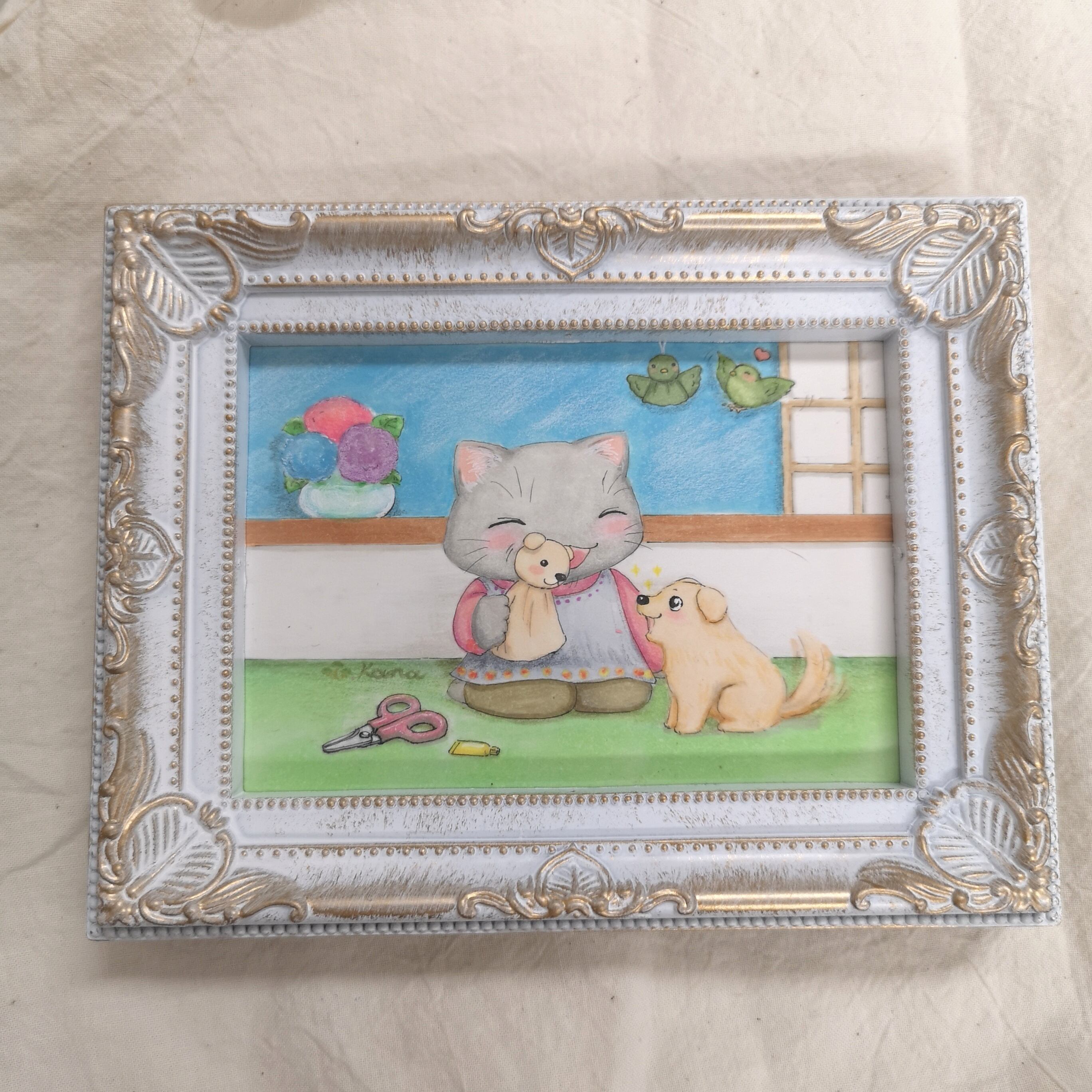 明日は晴れるかな? 色鉛筆、コピックで描いた原画です。 額込みサイズ 約11.7㎝×15㎝ 実物とでは多少色味が異なります。 画像の額に入れてお送りします。
