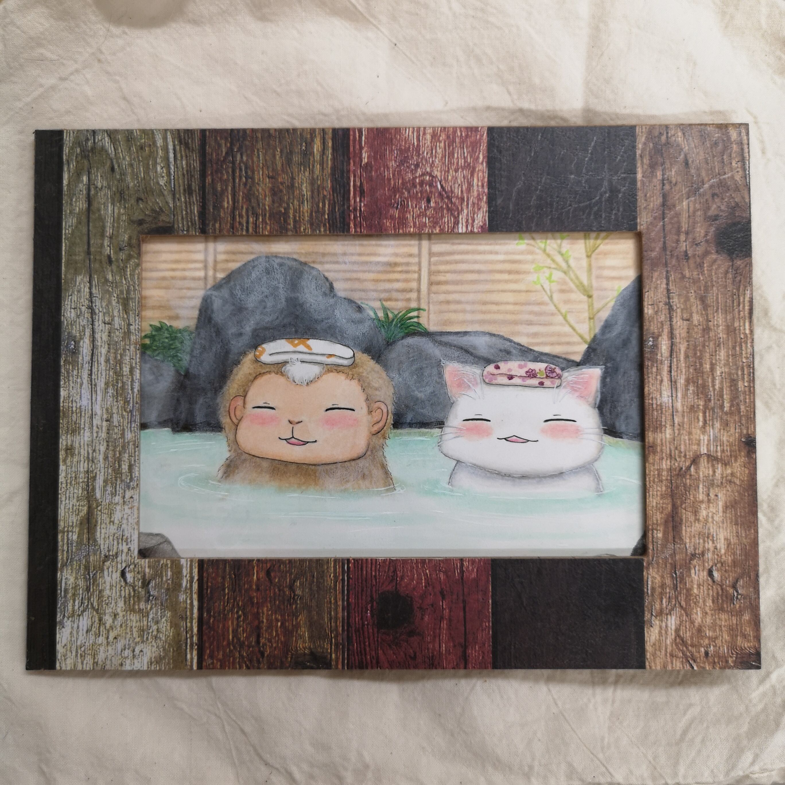 朝風呂も良し。 色鉛筆、コピックで描いた原画です。 額込みサイズ 約15㎝×20㎝ 画像の額に入れてお送りします。