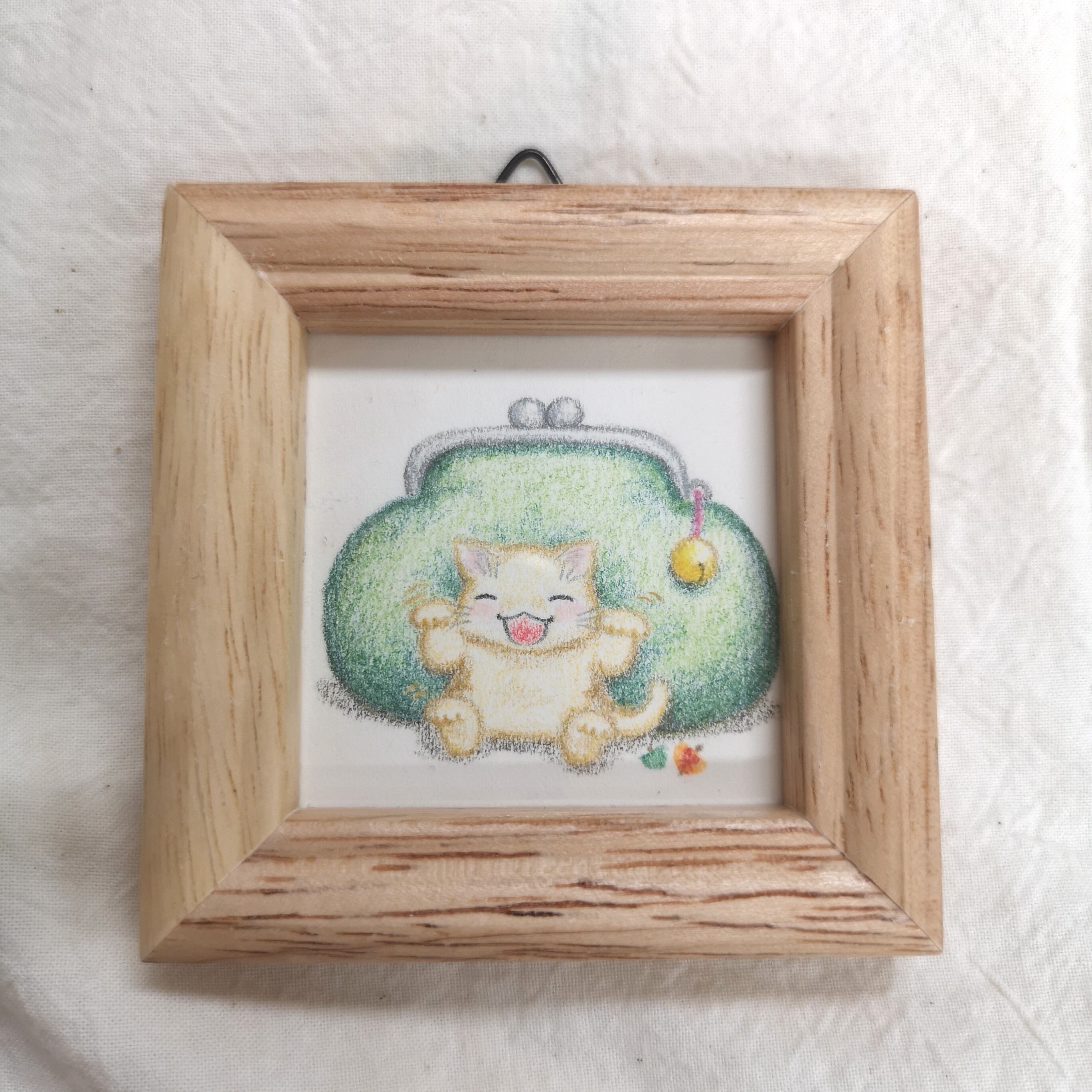 両手両足しっぽも使って財布に福を招き中。 色鉛筆画 額込みサイズ 約7.5㎝×7.5㎝ 画像の額に入れてお送りします。