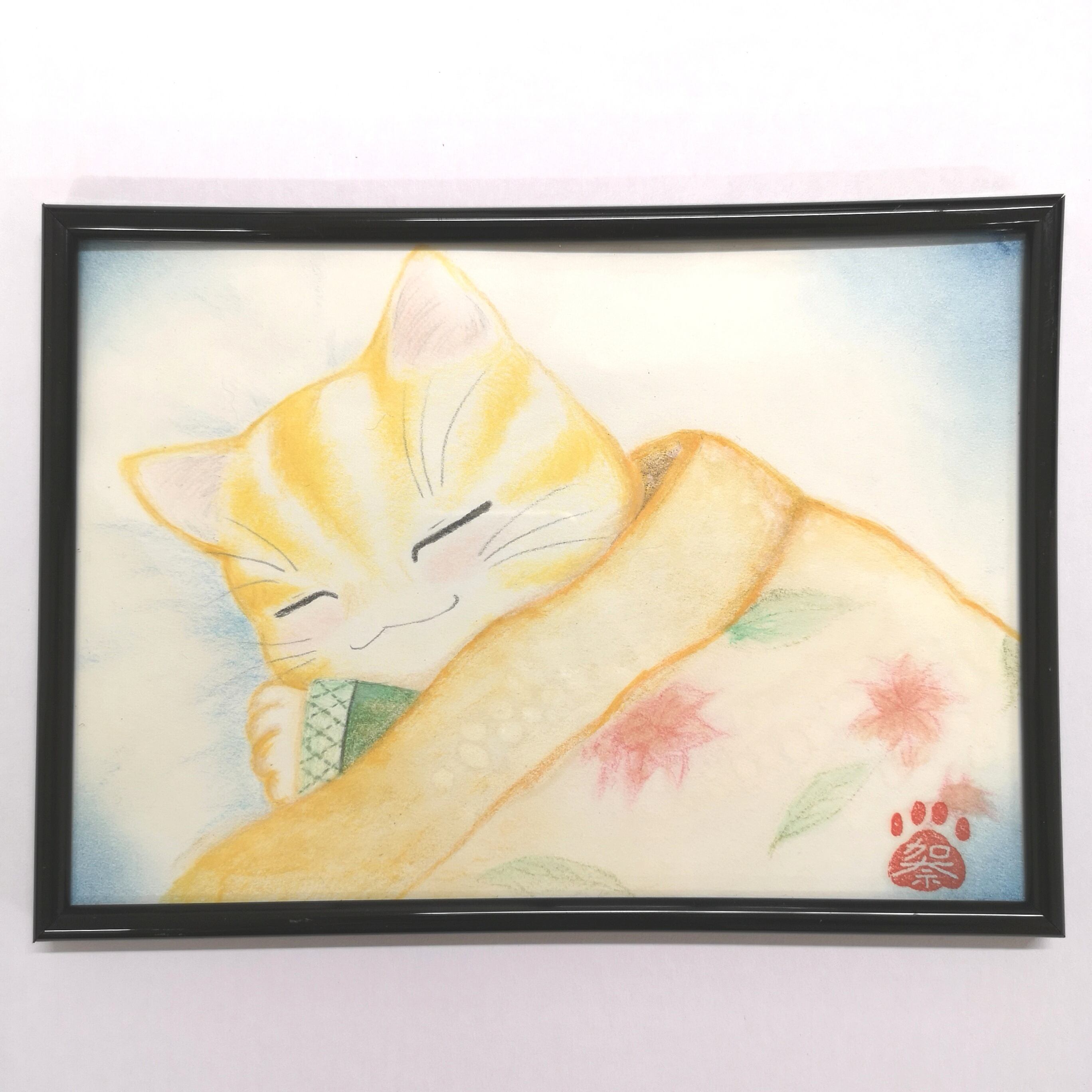 ふかふかお布団でスヤスヤねルこ。 安眠を願って✨ 画材 色鉛筆、パステル、油絵の具 額込みサイズ 約16㎝×22㎝ 画像の額に入れてお送りします。