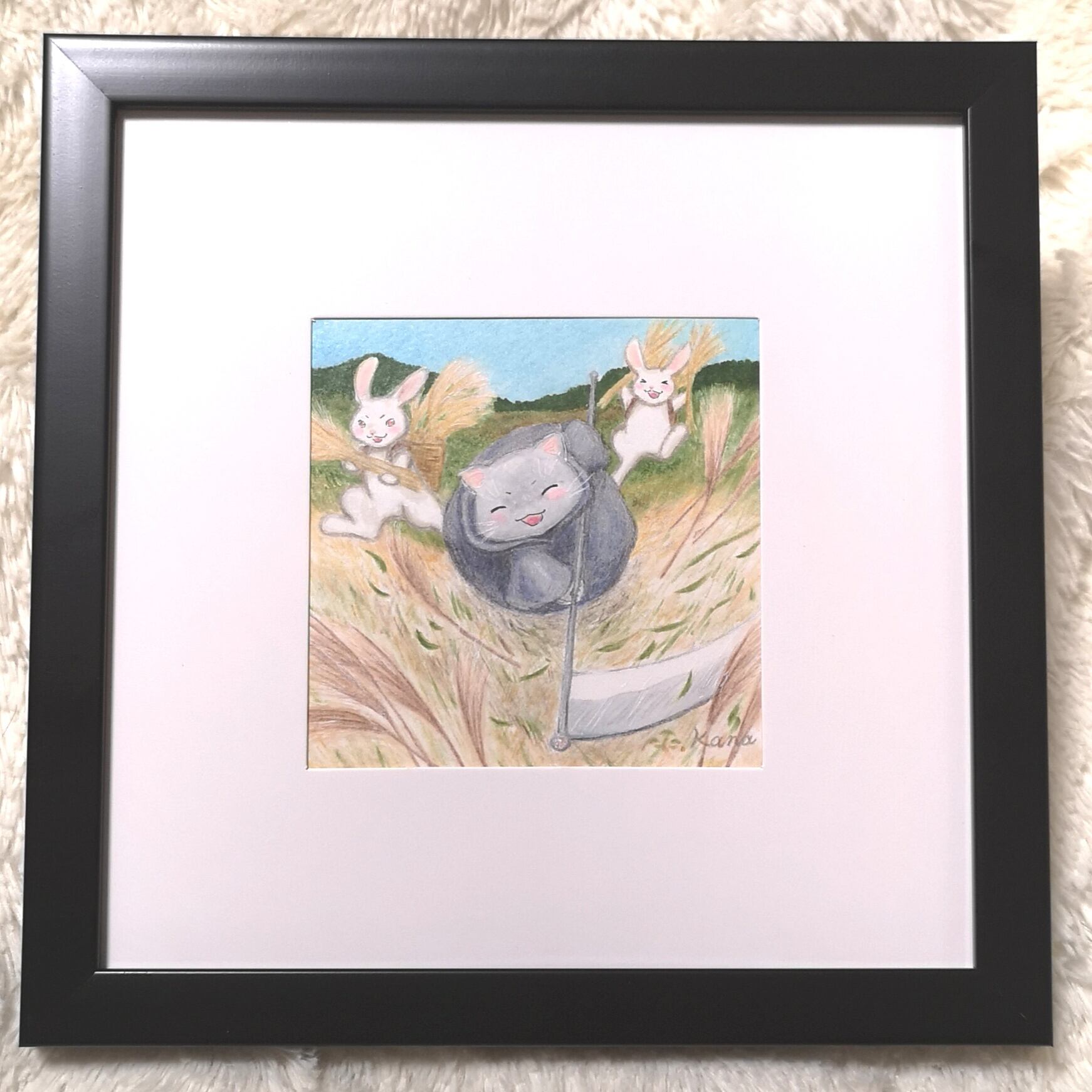 お月見推進委員会からの依頼により、ススキの収穫を死神ねルこがお手伝い❇️ 画材 色鉛筆、コピック 額込みサイズ 約20㎝角 画像の額に入れてお送りします。