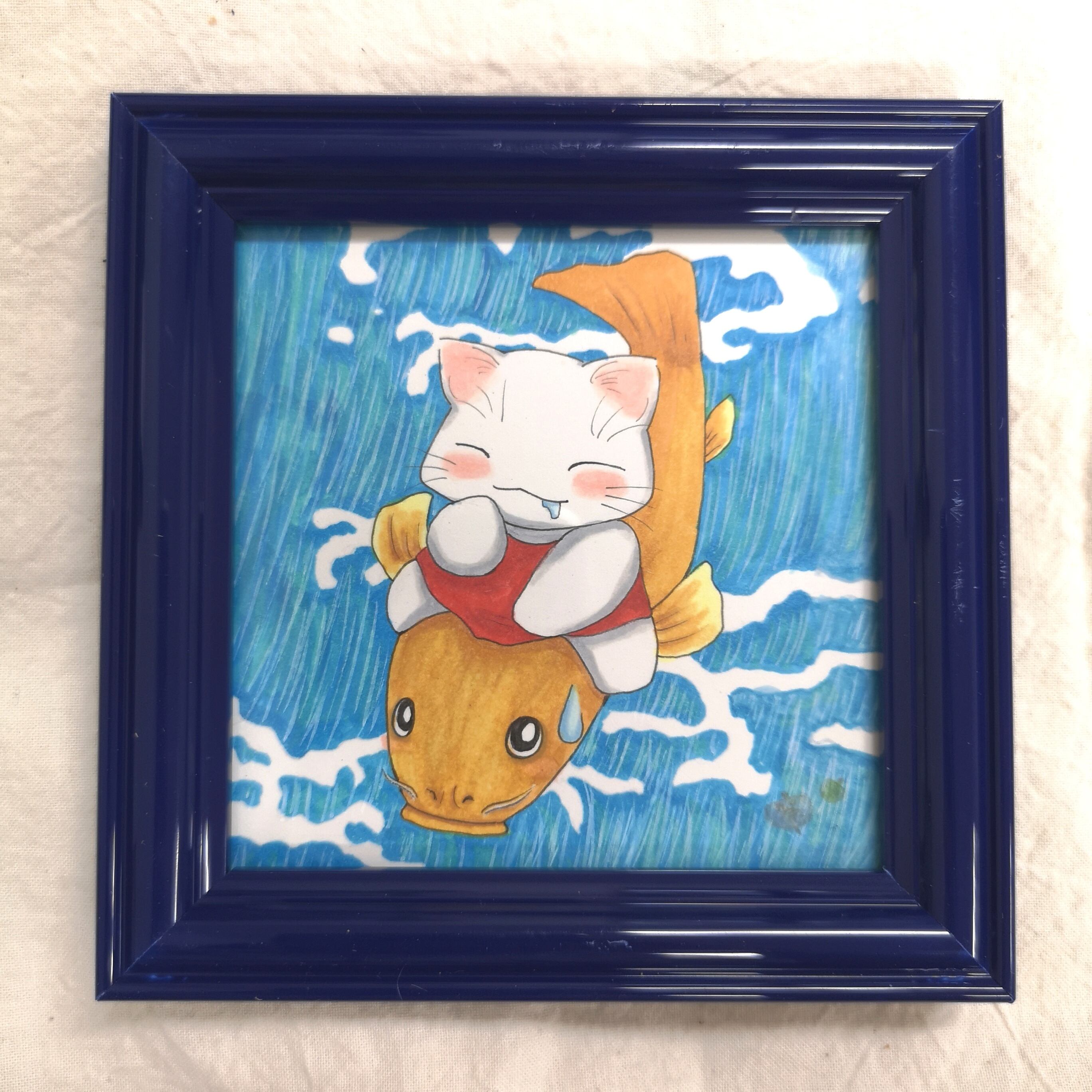 ちびっこねル金、鯉に乗って川下り。 画材 色鉛筆、コピック 額込みサイズ 約11㎝×11㎝ 画像の額に入れてお送りします。