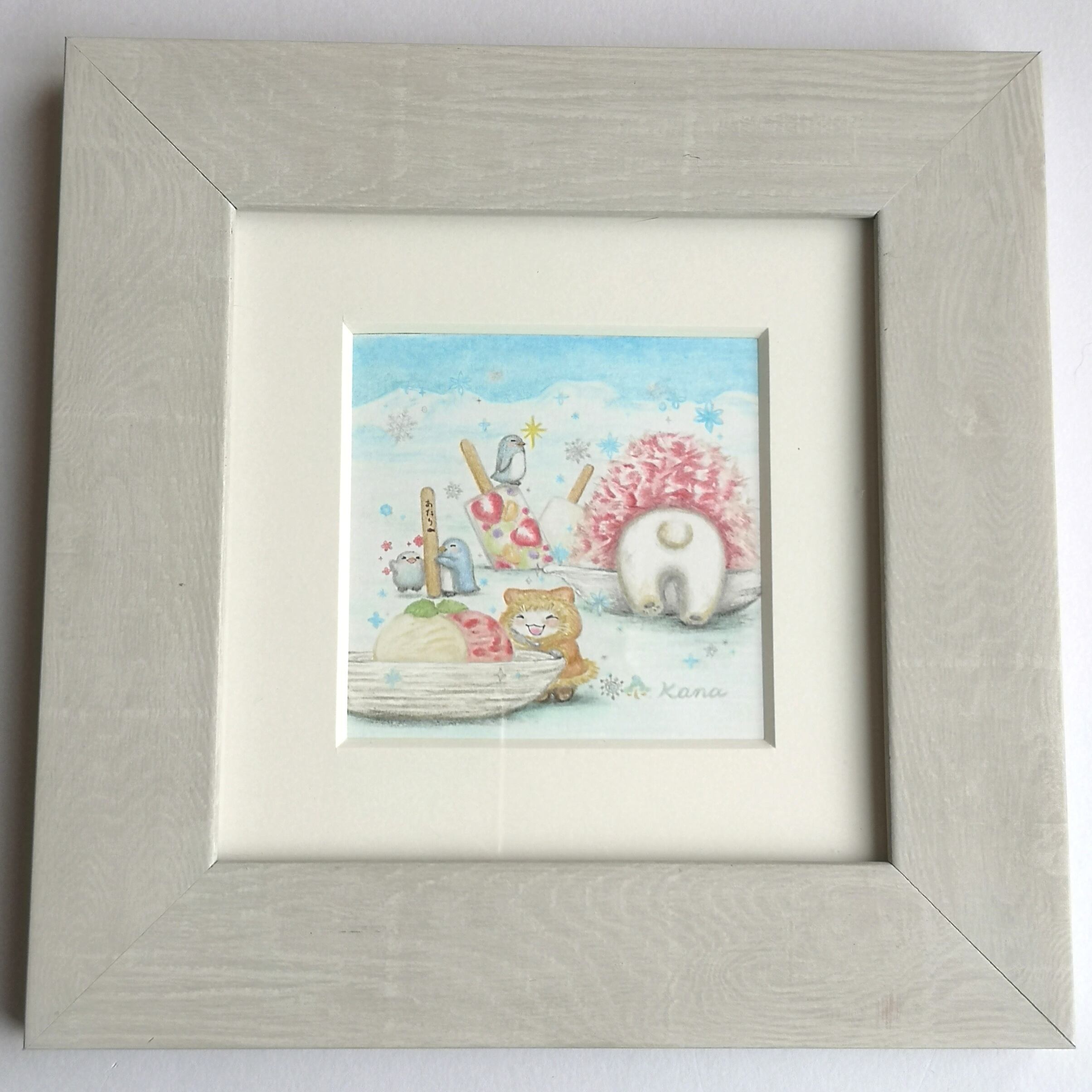 ヒンヤリおやつを食べたい時はここへ✨ 画材 色鉛筆、コピック 額込みサイズ 約21.5cm角 画像の額に入れてお送りします。 額の前面にはアクリルを使用しています。
