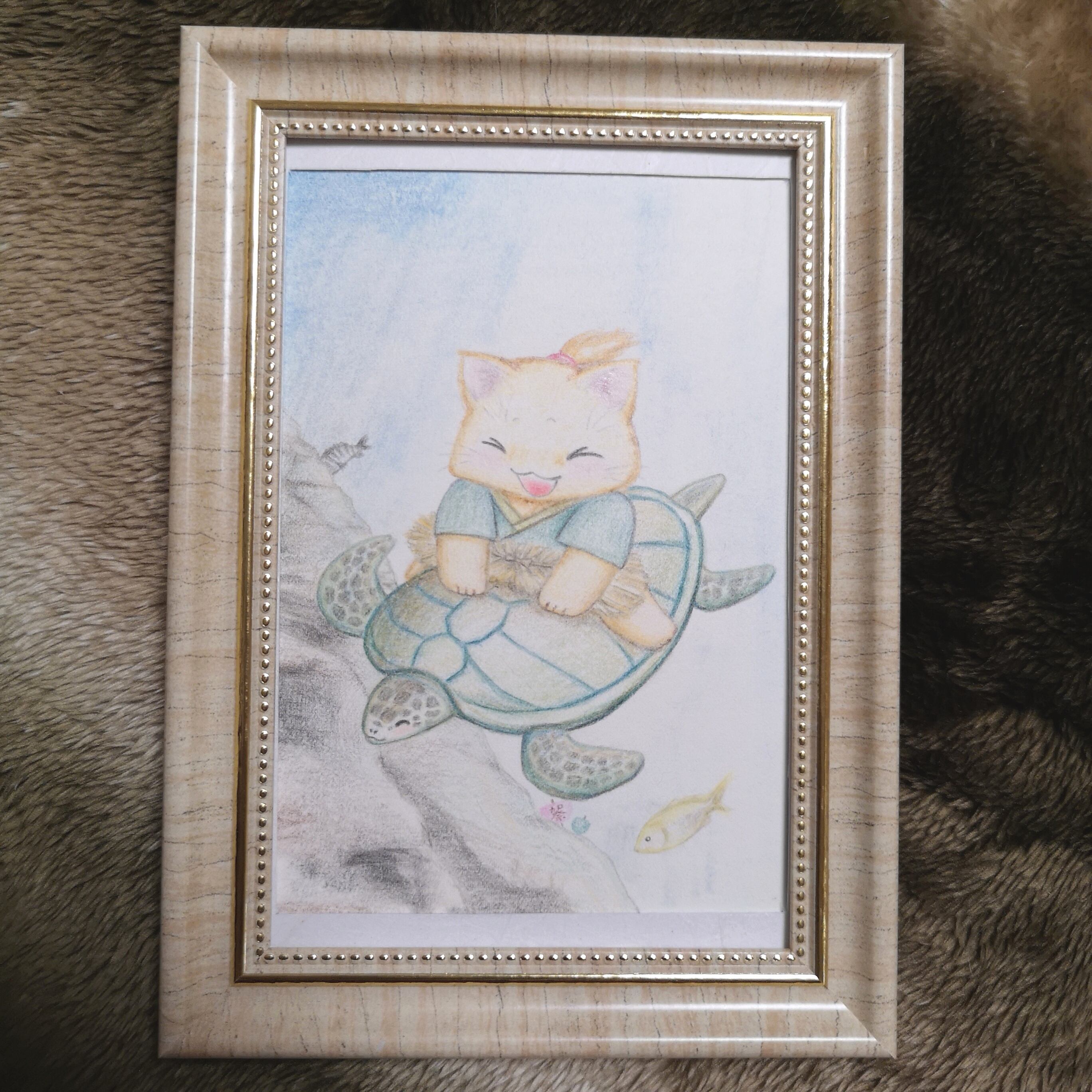 ねルこ昔話。『ねルこ浦島』 家族に心配かけないように暗くなる前に帰ります。 画材 色鉛筆 額込みサイズ 約18.3cm×13.2cm 画像の額に入れてお送りします。