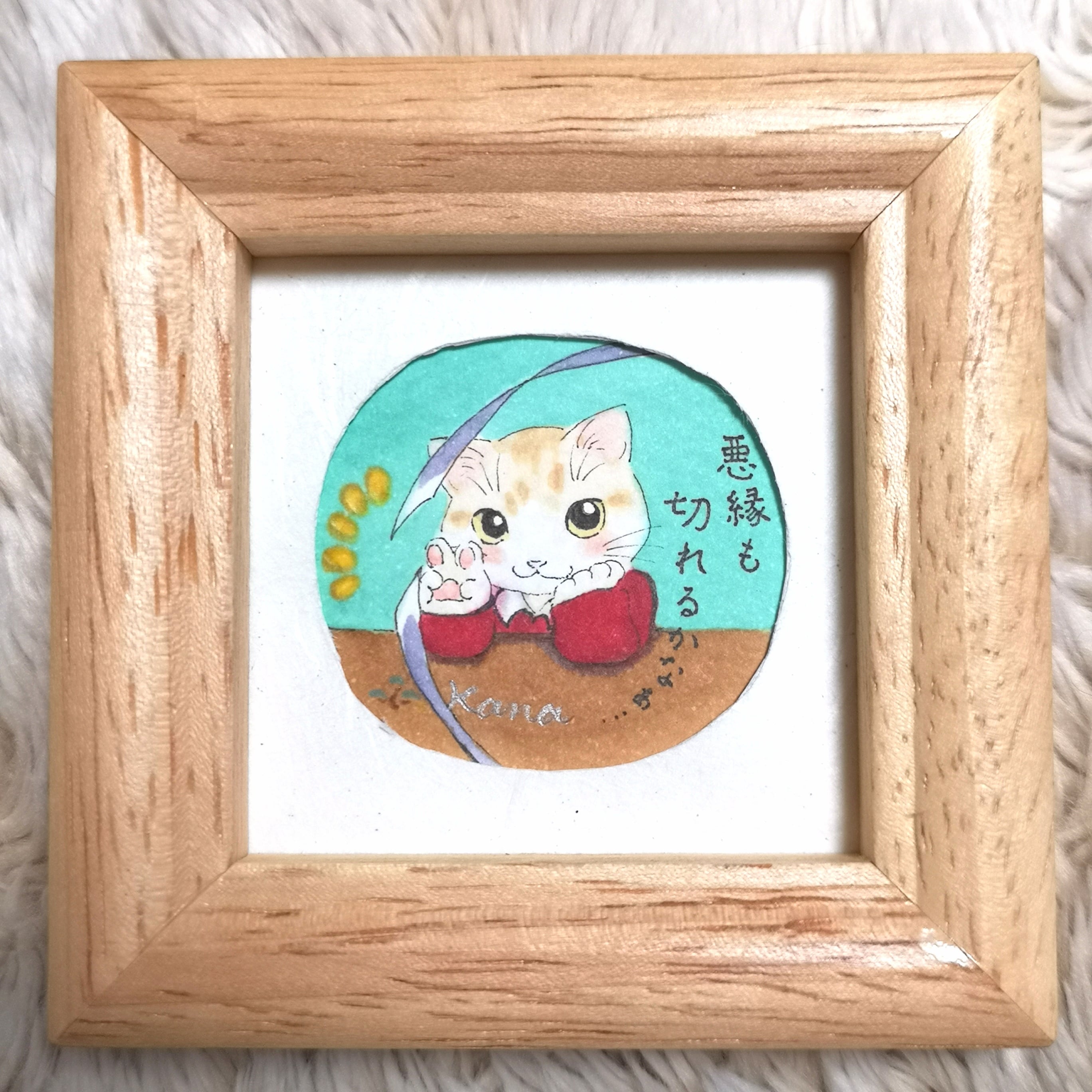 リボンを切るように❇️ モデルは我が家のジンちゃん(♂️)です✨(*´ω`*) 画材 コピック、色鉛筆 額込みサイズ 約7.7cm角 画像の額に入れてお送りします。