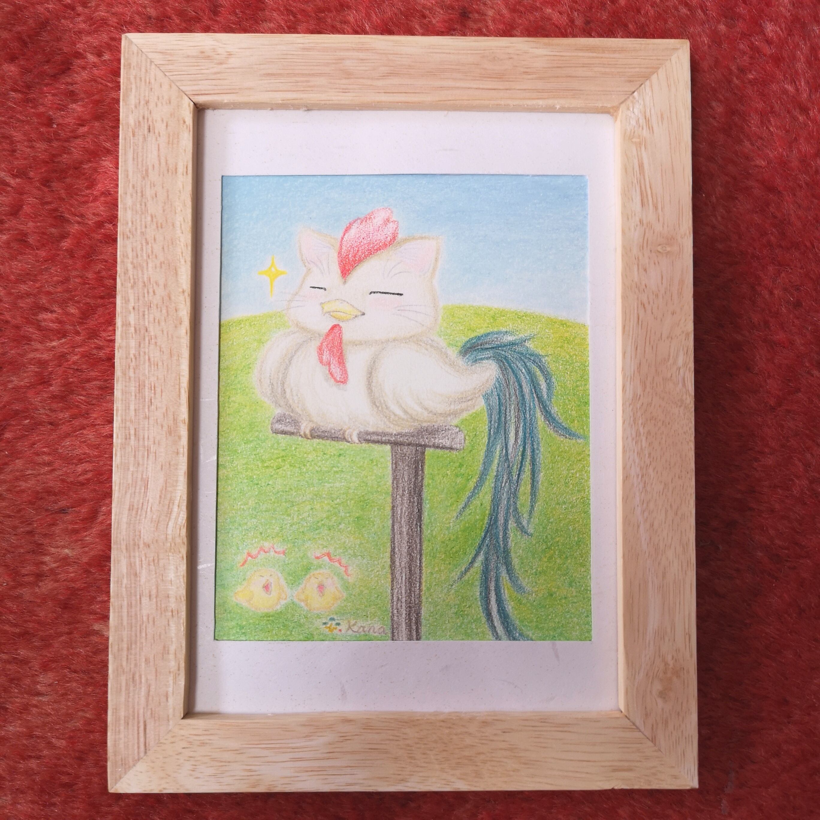 尾長鶏になった鶏なねルこ✨ 画材 色鉛筆 額込みサイズ 約20cm角 画像の額に入れてお送りします。